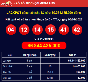 Ví dụ, nếu bạn chọn 6 số là 08, 17, 22, 31, 39, và 44. Nếu trong kỳ quay, bạn trúng 3 số bạn giành giải ba. Nếu may mắn hơn, trúng 5 số, bạn có thể chạm tay đến giải nhất. Và đương nhiên, nếu trúng cả 6 số, thì xin chúc mừng bạn đã trúng Jackpot!